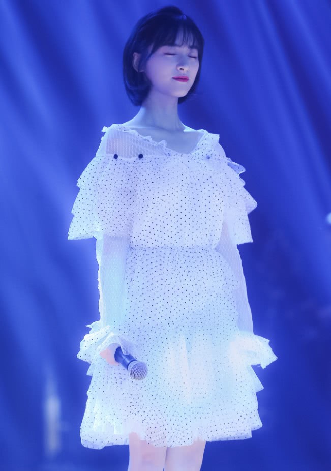 沈月身穿一件小V领的白色连衣裙,看起来属于半露肩设计,精致的锁骨很迷人,裙子的设计很少女,小花边搭配黑色波点,很复古和她的甜美气质,看起来素雅又恬淡!
