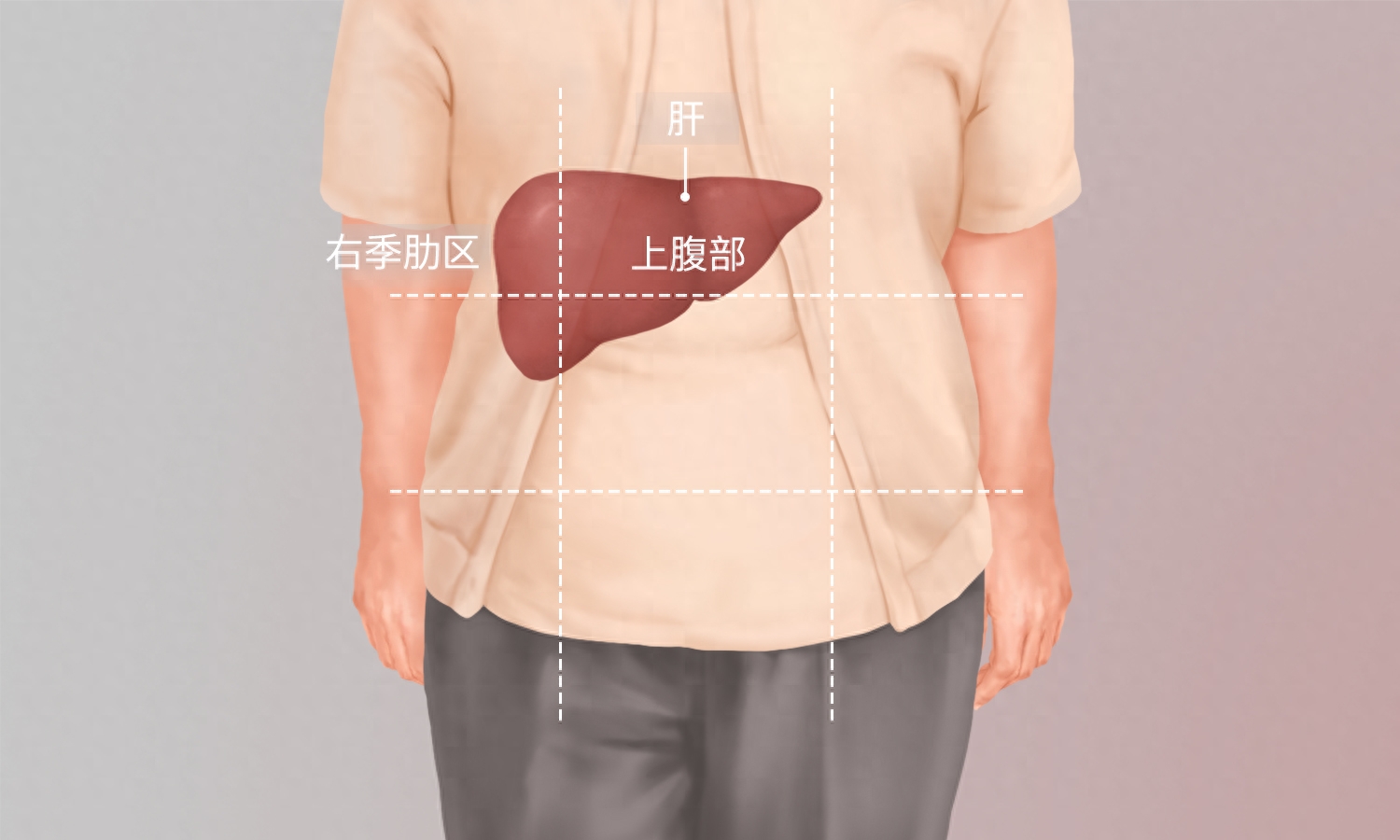 肝脏大部分(肝右叶)位于人体内的右季肋部(右上腹部)及上腹部,小部分(肝左叶)位于左季肋区(左上腹部)。