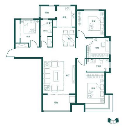 总面积约144㎡四居,南北通透性空间格局,规划为四室两厅两卫,动静分离,适合三口之家置业。