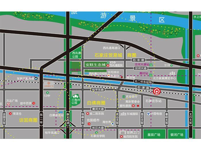 项目距离地铁1号线洨河大道站2500米,沿途经过石家庄东站、北国商城等站点,距离规划中的地铁5号线800米。