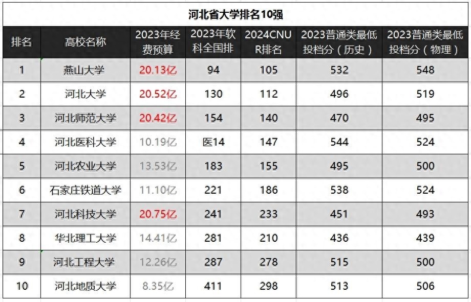 河北省10大强校实力排名,2023年经费、分数线汇总