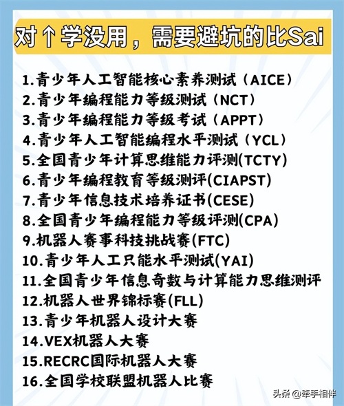 陷阱五:实际效应没法印证。机构经常会拿一些赛事,证书来宣传,但是真正坚持到参加比赛的寥寥无几,而且这部分学生基本上都是自己对编程感兴趣的,可以坚持学的。对于什么科技特长生、参加大赛中考、高考加分等等,各地差异非常大,很多省份是没有用的,这个大家一定要问清楚,避坑,避坑。