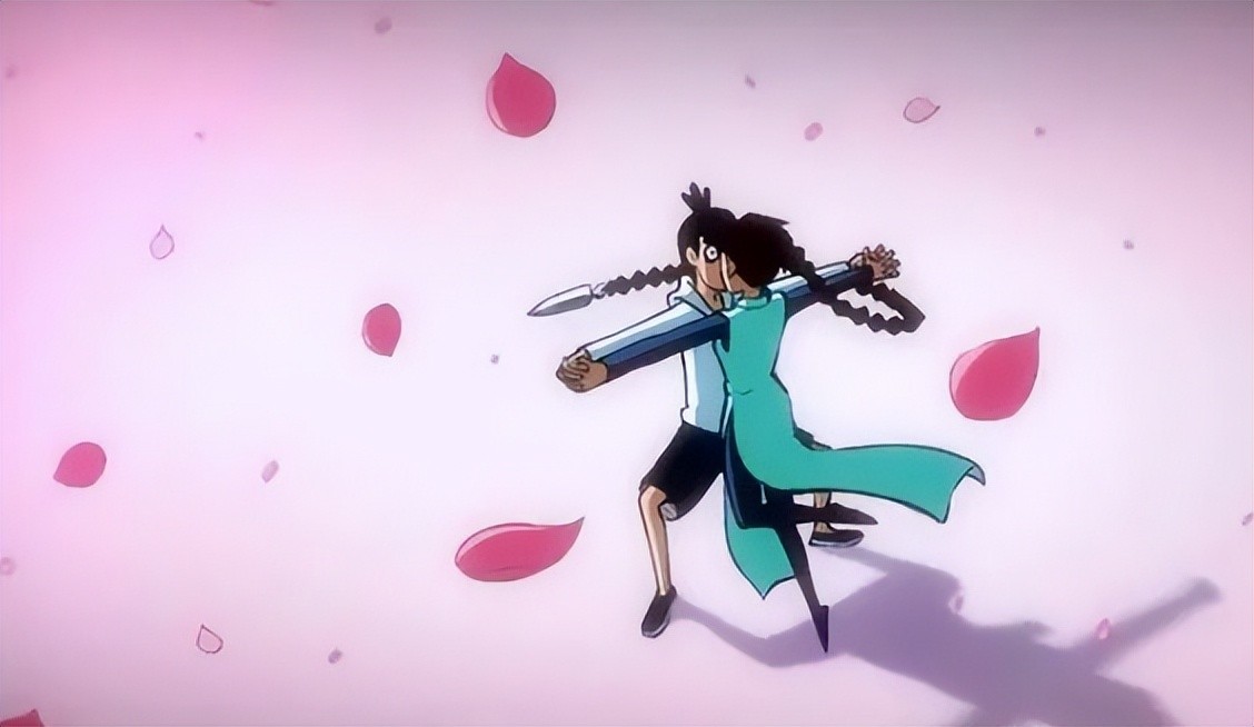 被摘下面具的美女刺客恼羞成怒,发动大招要置伍六七于死地。结果,伍六七来了个反转,抓住梅花十三往前一拉,于是就出现了一幕粉红的画风。