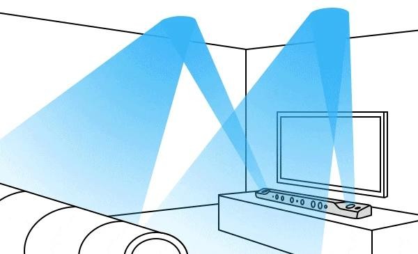 对于非天空音箱的布局,杜比全景声实现的方式无非两种,一种是带有内置于机身顶部的向上扬声器,将声音发射到天花板并反射回聆听位置。另一种是提供虚拟全景声效果,重建更宽的声场以带来沉浸感,但没有直接向上发射声音。