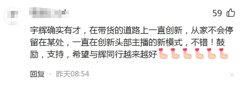 ▶▶宇辉确实有才,在带货的道路上一直创新,从家不会停留在某处,一直在创新头部主播的新模式,不错!鼓励,支持,希望与辉同行越来越好。