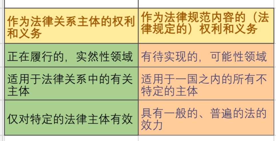 法律关系的内容就法律关系主体之间的法律权利和法律义务。法律关系主体的权利和义务与作为法律规范内容的权利和义务,虽然都具有法律属性,但其差别有三: