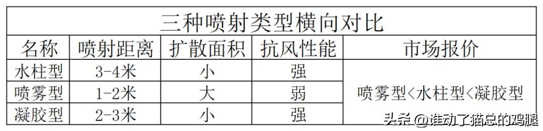 喷雾从喷射类型上分为:水柱型、雾状型、泡沫凝胶型。