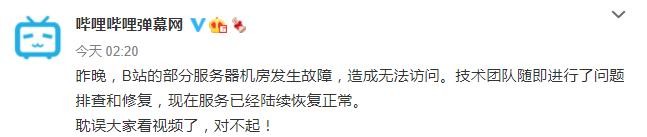 而B站也在凌晨2点20分发布回应,称原因为部分服务器机房发生故障。“技术团队随即进行了问题排查和修复,现在服务器已经陆续恢复正常。”