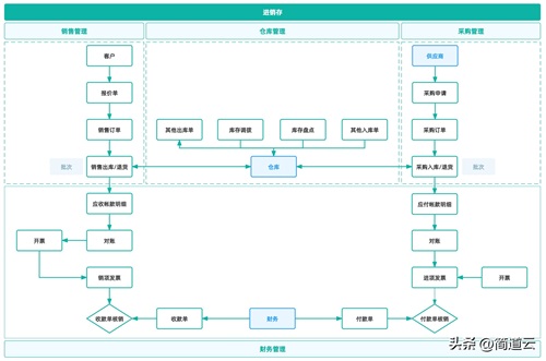 进:指询价、采购到入库与付款的过程。销:指报价、销售到出库与收款的过程。存:指出入库之外,包括领料、退货、盘点、损益、借入、借出、调拨等影响库存数量的动作。财:包括销售、采购等收付款管理,以及应付应收对账、开票管理。