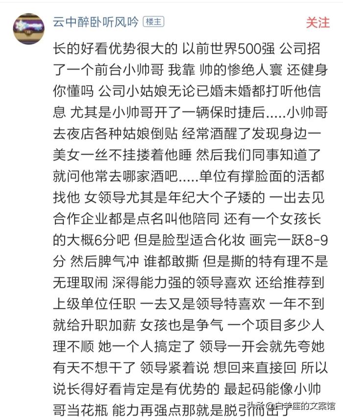 网友3:我们单位一半左右的中层领导都是女性,而且不是说多好看,都是五官比较端正的女士。其实对女人来说,长的好看会得到很多锻炼自己的机会,可能就会得到晋升的机会,再说,形象好坏也关系到企业的门面,员工那么多,素质基本没有太大差距,长的丑的胖的,晋升的机会就会小些。