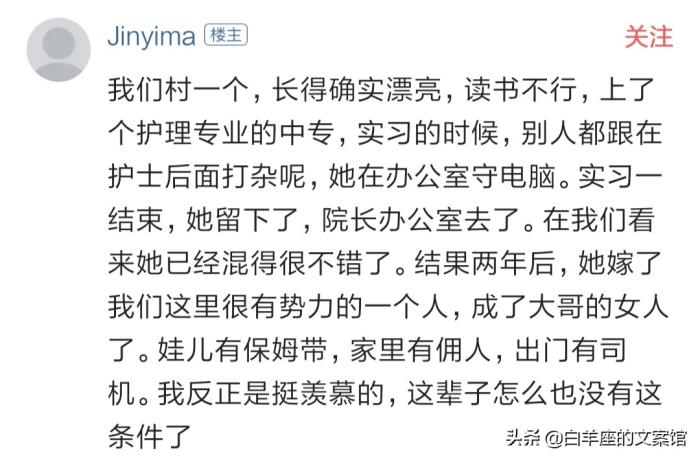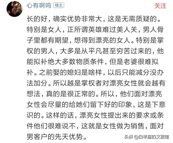 网友2:有用,真的有用,如果你长得漂亮,年纪又轻,二十岁左右,那你面临的诱惑会非常多,会有不少人追求,未婚的还有已婚的,工作上,只要稍微开下口,就会有人帮助你,去食堂买饭,人家甚至都会多给你一点,给你介绍对象,如果你真的漂亮,别人都不好意思给你介绍差的,这种漂亮好好利用,不要太作,不会过得很差的,当然漂亮加强学历和能力再高一点,那是最好的。