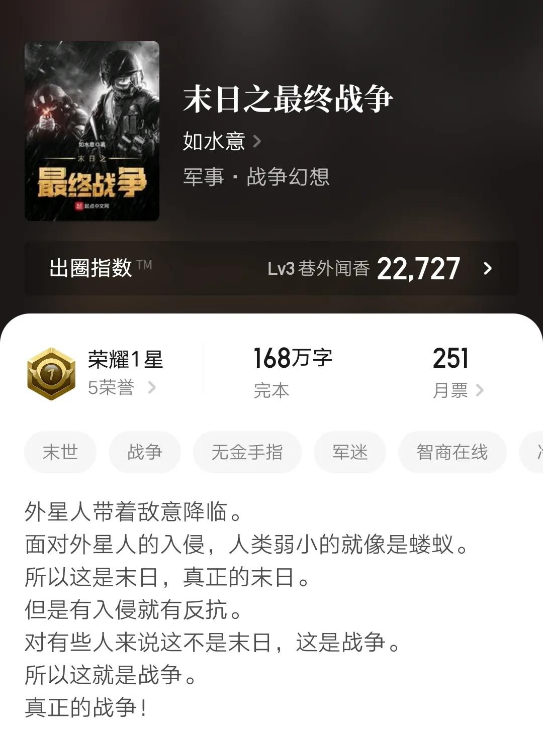 外星人入侵,丧尸爆发,变种基因、外星科技和传统武术三重加持,神州崛起应战,战争三部曲终结篇!作者文笔细腻,剧情过渡合理,行文流畅自然,情节精彩好看。二零年十月完本作品。
