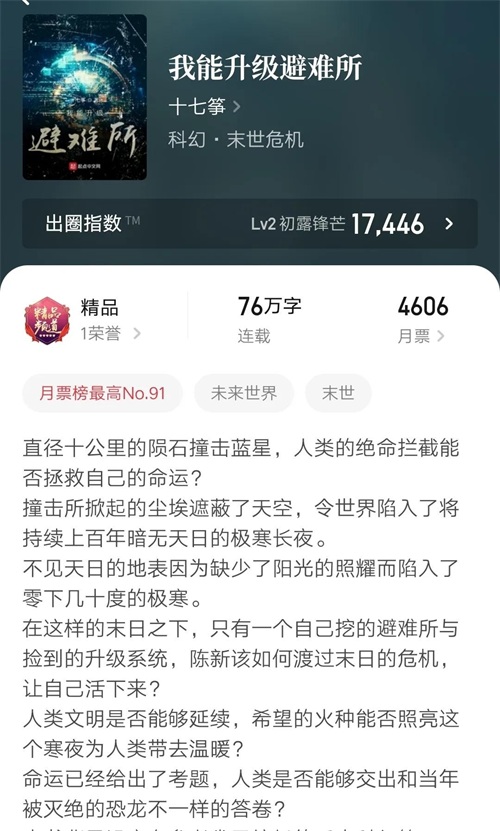 黑科技系统文,末日求生种田风格,已经将近百万字。主线是避难所升级改造,创意和开局借鉴了B站视频。现在是单人生存状态,估计后续最多变成小团队生存,男主在避难所蹲着的时候估计会永远保持无敌状态,不会遇到糟心事。