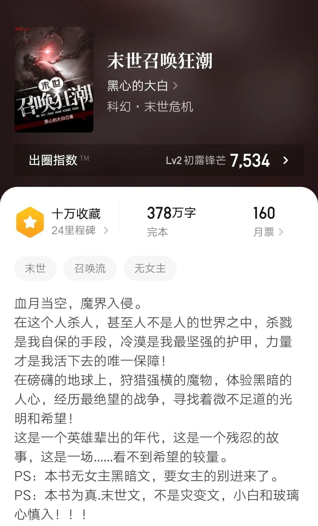 前期有大大小小的问题,金手指的存在在一定程度上降低了书的硬核程度和保持逻辑合理的难度,拓宽了本书的受众,喜欢末日,灾后生存的书友可以试试这本书,质量相当不错。