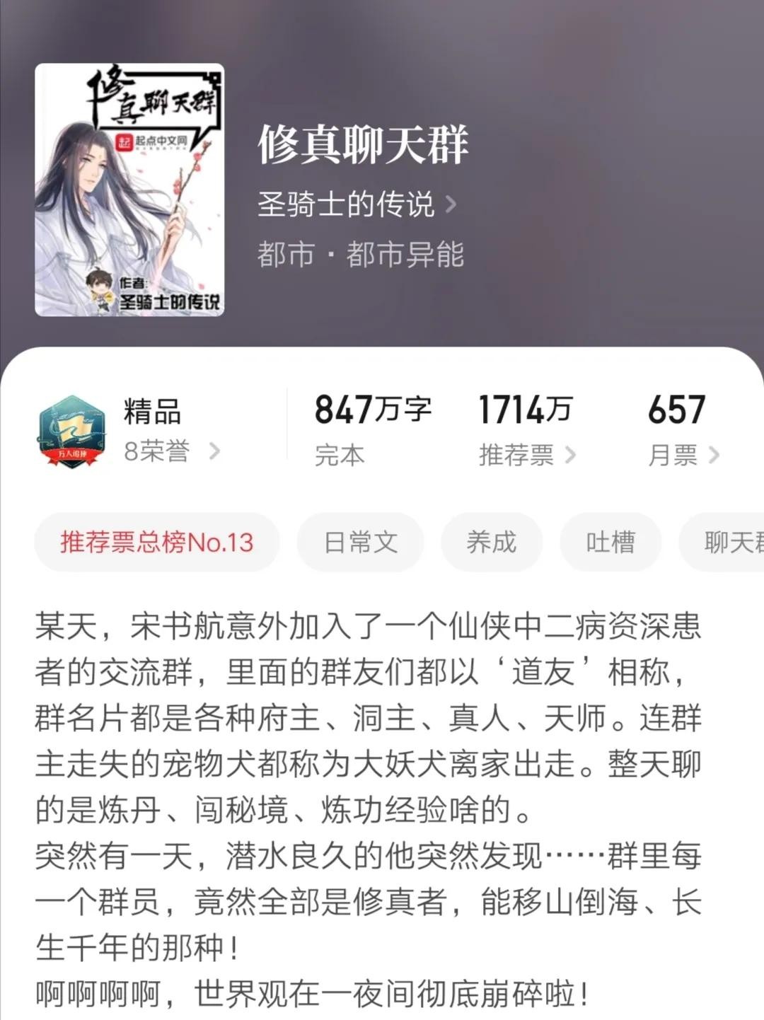 修聊能够获得如此大的成功,不是一朝得来的,从07年写作到15年发布修聊,经过了漫长的时间沉淀,本身奶骑的写作水平,讲诉故事的能力就很强,加上写作技巧的加深,对剧情的把控力度,粉丝后援团的大力支持,另外还有这本小说从设定,到人物各方面普遍有所提高,还是人们熟悉的都市类型,代入感很强,所以这本书才获得了前所未有的成功,被广大读者深深喜爱。