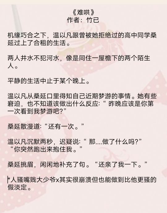 剧情设定:这本算是男女主双向暗恋文,男主桑延,性格腹黑高傲,妥妥大少爷一个,高一军训时女主温以凡穿着白裙跳了一支舞,自此桑延上了心,女主温以凡外表长得明丽漂亮,性格却温软,不容易生气,因为高中父亲的去世,母亲的改嫁,她寄宿在亲戚家,内心变得敏感害怕被抛弃,男主就像太阳般闪耀对她来说,加上亲戚的贬低与嫌弃让她觉得自己配不上男主。男主从高中到工作以后还是一直喜欢女主,到后面同居产生交集。