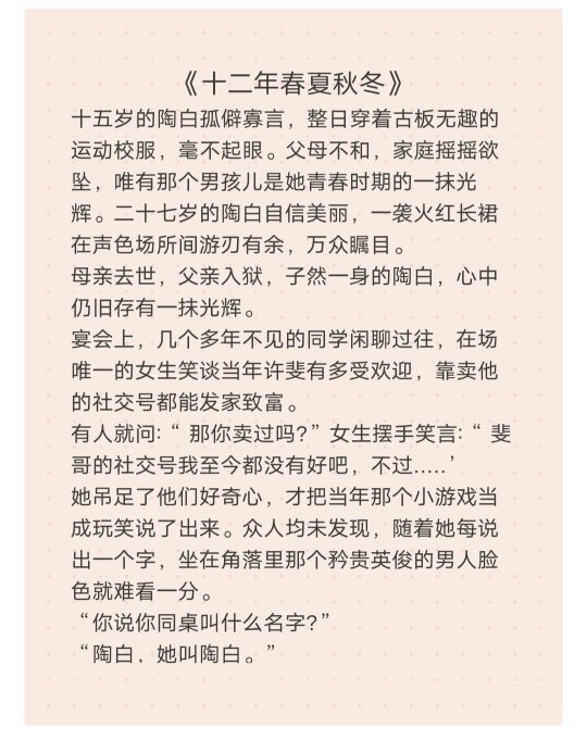 剧情设定:又是一个酸涩的暗恋故事,女主陶白,年少时孤僻寡言,毫不起眼,男主许斐,矜贵英俊,因为一个巨大的误会与现实原因分离十年,前面互动少后面互动多。