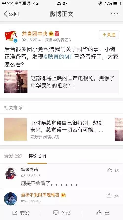 2月14日,桐华小说《曾许诺》发布了将要影视化的消息,同时曝光了该剧的男女主角分别为黄晓明、宋茜。消息一出,除了书粉以及演员粉讨论外,网上出现了一股大规模的“抵制《曾许诺》风”,这其中不仅有网友抵制,还有很多大号官微发布文章抵制《曾许诺》,例如共青团官微、广电实名认证编辑以及共青团中央官微,直言桐华“歪曲历史”“侮辱祖宗”。