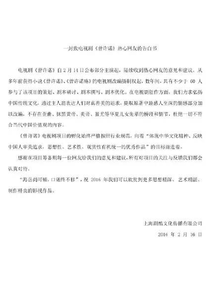 2月16日,《曾许诺》出品公司上海剧酷文化传播有限公司发布声明称在电视剧改编过程中将只提取原著中感人至深的情感部分,不会存在抹黑黄帝、炎帝的情节,疑似将考虑架空历史进行改编。
