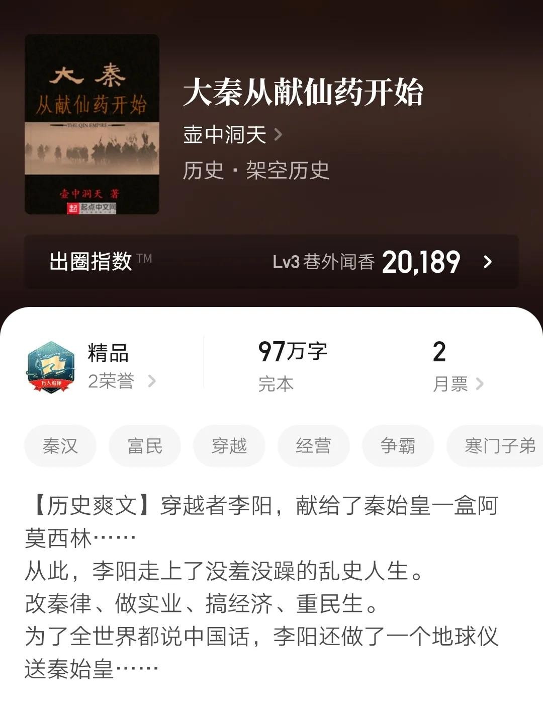 这一本主角是身穿,还带去了治疗肺病的西药。我仔细看了一下简介,嗯,这一位居然也给始皇帝献了一个地球仪(前面帝国吃相也有一个地球仪哦),可见大家都努力让始皇帝去争霸“天下”,不要只看着眼前的六国统一就没有奋斗目标了。