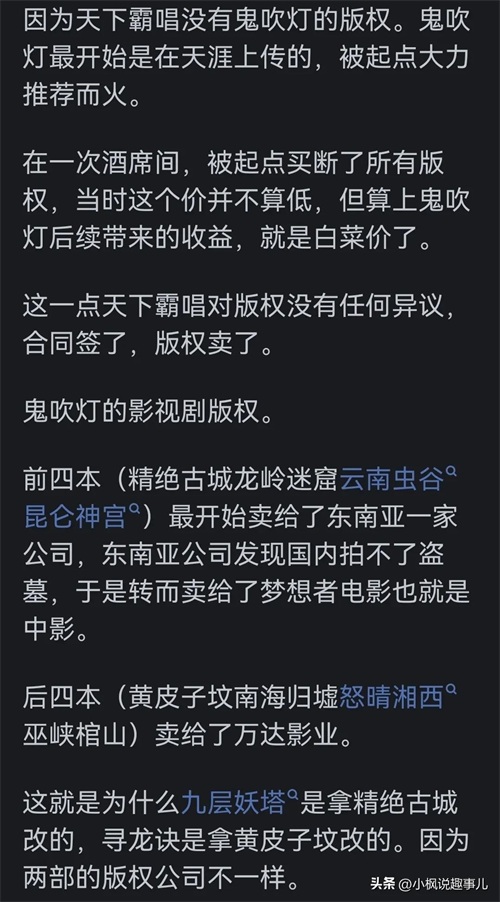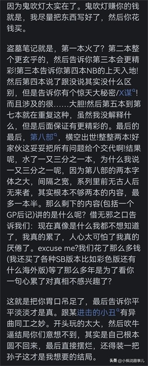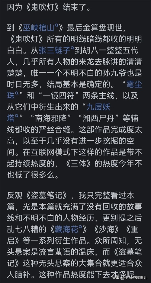 盗墓笔记因为没有完结,所以粉丝能有一些参与感,鬼吹灯逻辑太严密了没给我一丝插入的空间,我好像只是一个观众