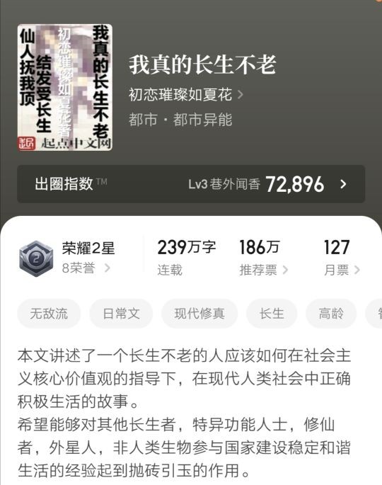 都市长生日常文,为什么这么说呢,因为看到目前为止,我还没有看到异能,修仙这类出现,除了主角设定为长生不死这一点。主角随性,怀着平静的心态活在现代社会,作者文笔优秀,剧情偏清淡,以我看过的这部分剧情来讲,此书不适合喜欢激烈,刺激的书友,和其他无敌流截然不同。连载中。