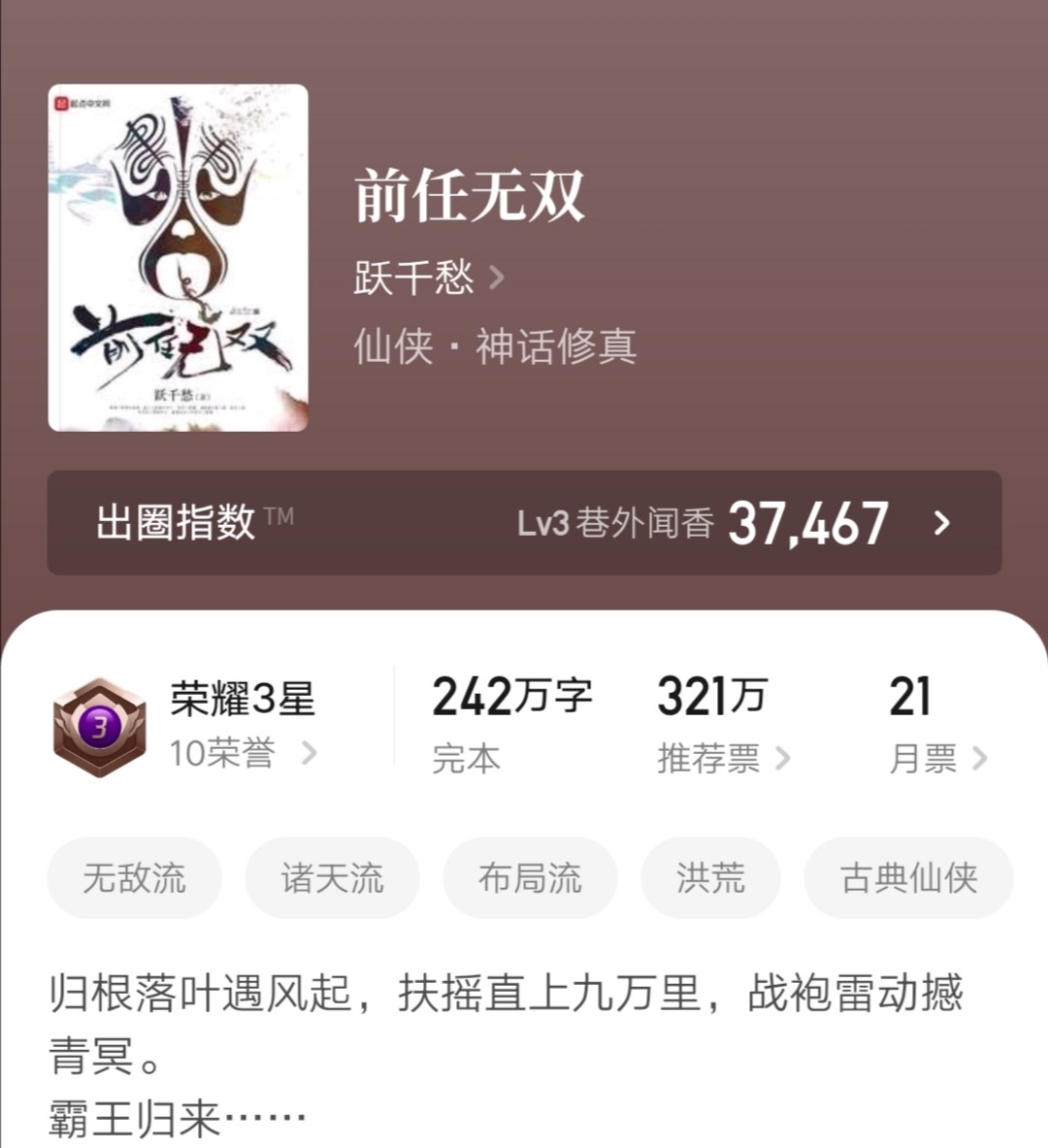 故事正是从前朝余孽林渊逃出仙都,蛰伏家乡不阙城开始述说。感觉这本书的书名和前面的一些平淡章节劝退了不少读者。但中后期是真的好看,高潮不断。《前任无双》这本小说七百六十四章完结,可能来的有点突然,还有不少伏笔暗线没有交代清楚,但也确实不算烂尾,称得上是一个好结局了。