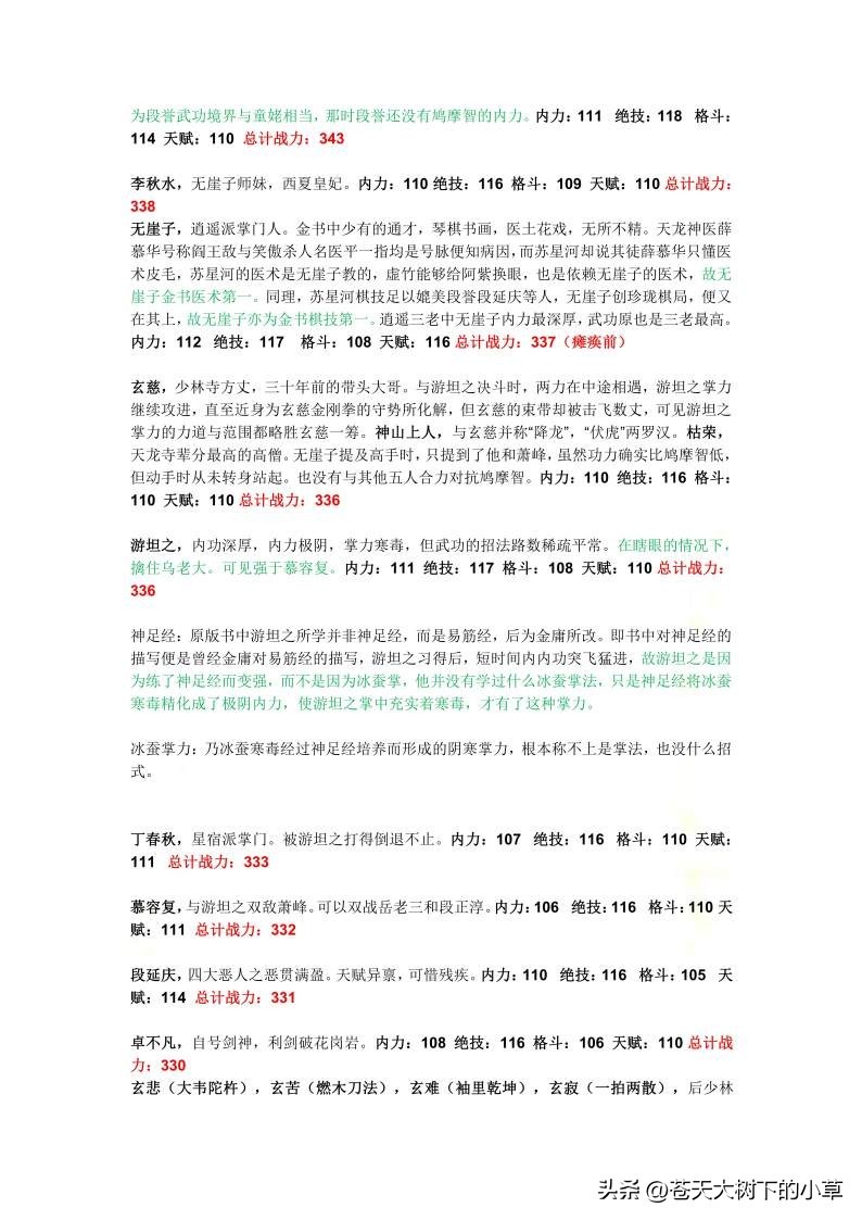 我将武功构成大致分为:内力(包含内力以及内功),格斗(包含外功,实战经验与技巧,以及兵器的运用),绝技(包含绝技强度,精通程度,以及全面性),天赋(单指个人资质,即智能和体能,不包含武功增益所带来的成长),总计战力(内力,绝技,格斗三项综合,与天赋无关),论据基本来源于金庸一百问和新修版小说原文。