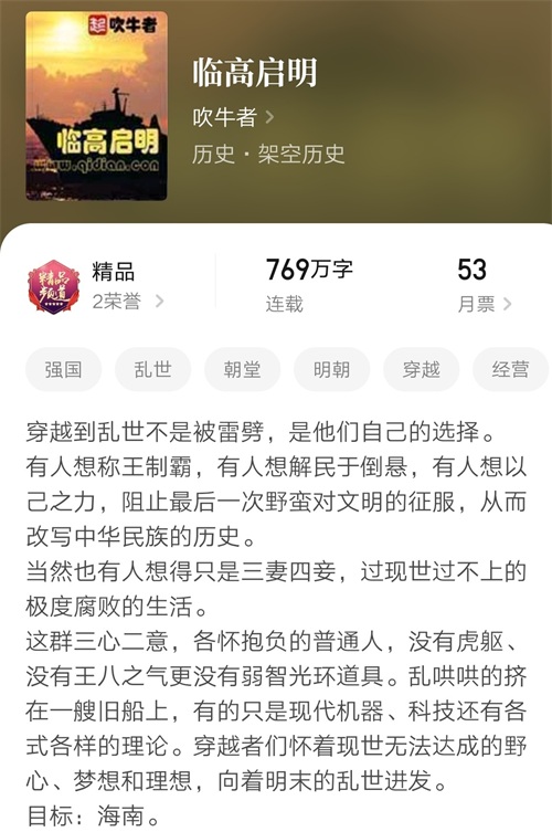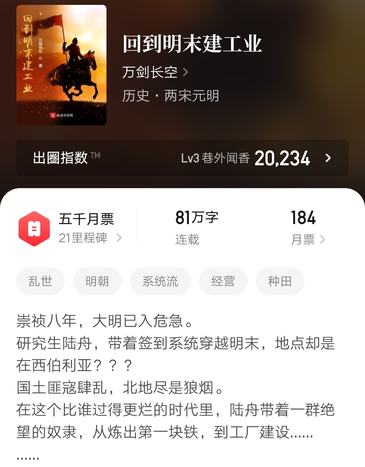 3、种田文,开科技树争霸天下。文笔流畅,故事完整,风格轻松前期造反最精彩,后期逐渐平庸。