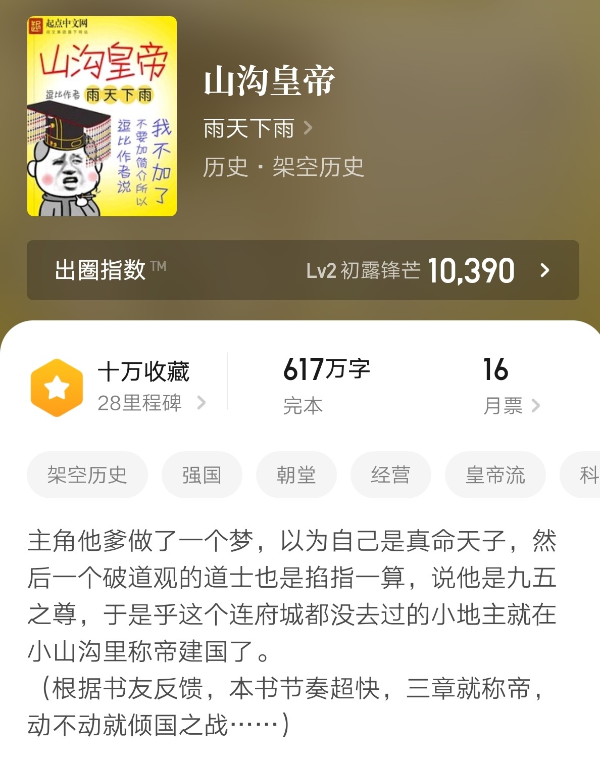 1、本书有新意,开局小山沟被迫称帝,无奈之举。作者行文幽默,通过反差让你不禁捧腹大笑。