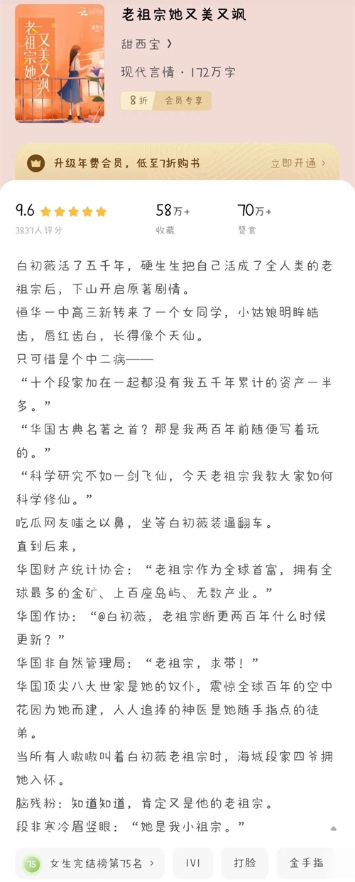 爽文。爽文那么多,都是主角一堆马甲时间管理大师。但这本,给了一个合理解释,那就是,女主活了五千年,好吧,也不是那么合理女主是神,够合理了吧。活了那么多年的仙女自然啥都会,凡人怎么可能斗得过她。
