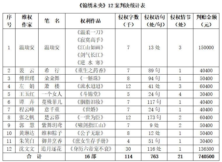 本次宣判的十一案涉及的作者和作品包括:温瑞安的作品《温柔一刀》、《寂寞高手》、《江山如画》、《剑气长江》和《逆水寒》;裴云(笔名希行)的作品《重生之药香》;傅世瑾(笔名朵朵舞)的作品《一斛珠》;左娟(笔名萧楼)的作品《流水迢迢》;王玉红(笔名一个女人)的作品《斗锦堂》;谭卉(笔名蔓殊菲儿)的作品《胭脂泪妆》;程云峰(笔名意千重)的作品《世婚》;张之帆(笔名楚云暮)的作品《一世为臣》;郭慧(笔名紫舞玥鸢)的作品《啸剑指江山》;黄琳达(笔名维和粽子)的作品《公子无耻》;朱笑白(笔名御井烹香)的作品《庶女生存手册》。《锦绣未央》网络版270万字左右,涉及抄袭16部作品,侵权总字数约114千字,侵权语句共计763处(句),侵权情节共计21处。