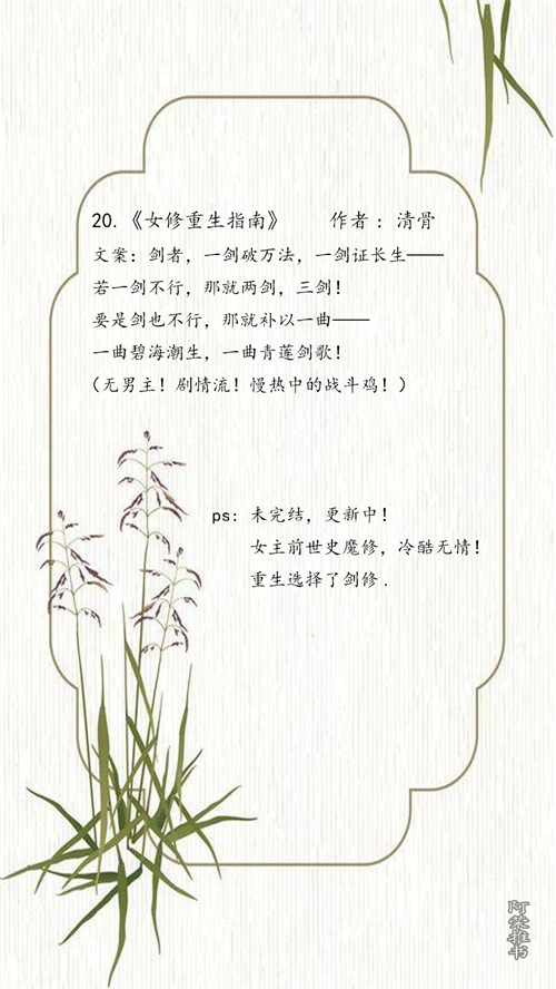 《我不成仙》 作者:时镜《师姐的剑》 作者:吃书虫子《慢慢仙途》 作者:绝世小白《驭灵女盗》 作者: 翦羽《一仙难求》 作者: 云芨《仙灵图谱》 作者: 云芨《天命为凰》 作者: 云芨《仙本纯良》 作者:正月初四《我是极品鼎炉》 作者:正月初四《凡女仙葫》 作者:冬天的柳叶《重生女修仙传》 作者: 眷念《素女寻仙》 作者: 刺嫩芽《青云之上》 作者:莲花郎面《门派只有我一个渣渣》 作者: 水木清华《误佛》 作者: 扶华《丹宫之主》 作者:秦日蓝《太素》 作者:看泉听风《史上第一佛修》 作者: 青丘千夜《一指成仙》 作者: 潭子《女修重生指南》 作者: 清骨《自欢》 作者: 袖侧《我家徒弟又挂了》 作者: 尤前《总有人想带坏我徒孙》 作者: 尤前《琴音仙路》 作者: 写文娱乐自己《仙声夺人》 作者: 午夜牧羊女《天下男修皆浮云》 作者: 青衫烟雨《天下男修皆炉鼎》 作者: 青衫烟雨《明夷于飞》 作者: 李写意《半劫小仙》 作者: o滴神《魏紫修仙传》 作者: 我为你回眸《仙瑜无瑕》 作者: 我为你回眸《男人如炉鼎》 作者: 姬昭璋《帝神通鉴》 作者: 孤在上《惟吾逍遥》 作者: 微斯人也《天道制霸计划》 作者: 幻镜真人《采石记》 作者: 顾仁棉《绝品灵仙》 作者: 顾仁棉《一剑诛仙》 作者: 猫蔻《修仙与男主为敌》 作者: 猫蔻《前任遍仙界》 作者: 青青绿萝裙《保卫国师大人》 作者: 风行水云间《宁小闲御神录》 作者: 风行水云间《大魔王娇养指南》 作者: 风行水云间《魔修求生指南》 作者: 桑莘《功德印》 作者: 青衫烟雨《勿扰飞升》 作者: 月下蝶影《夫君是未来大魔王怎么办》 作者: 雾矢翊《与天同兽》 作者: 雾矢翊《散修难为》 作者: 浮生若朝露《青云上仙》 作者: 方洄