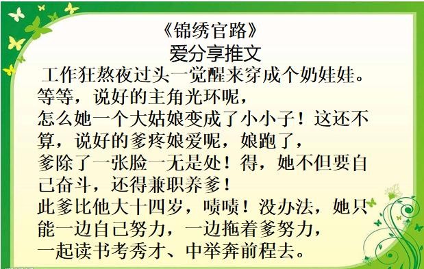 过程温馨结局圆满!女穿男,督促嫩爹努力上进,斗渣爷爷后奶奶、努力科举混迹官场,主角通过奋斗收获辉煌人生。正能量爆棚、代入感不错、情节曲折动人、文笔不小白!