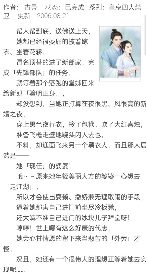 古灵的短篇小说都很有意思,是我学生时代最喜欢的作者之一,篇幅短,且网上能免费看,推荐大家书荒时阅读。下面首先推荐皇京四大禁卫系列,作者:古灵