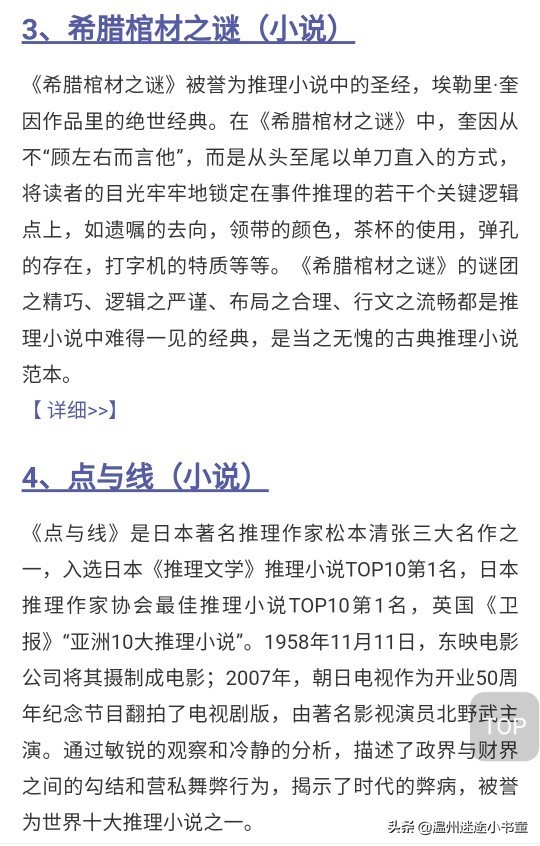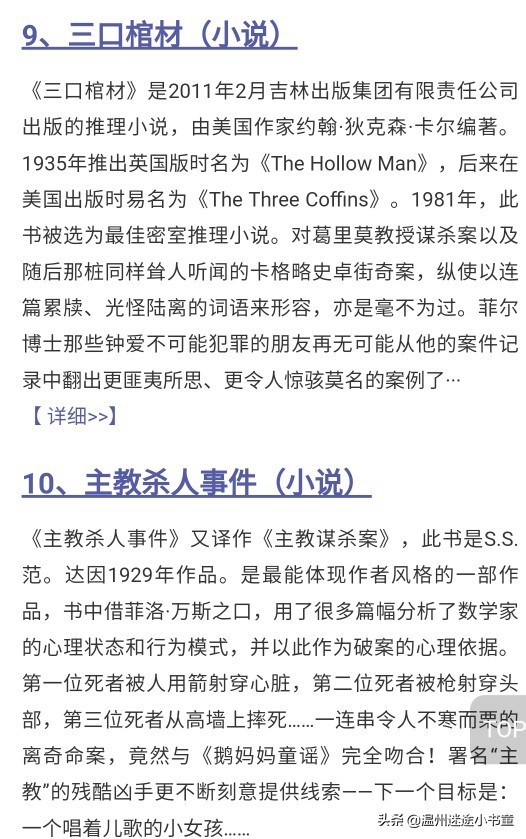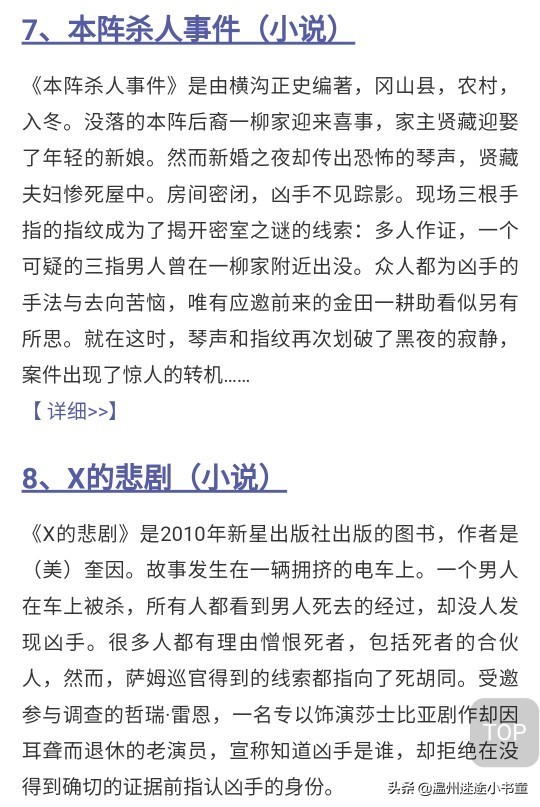 烧脑!18部值得一看的悬疑推理小说 来源:人民网 《心理罪》《烈日灼心》《法医秦明》……你都看过吗?严谨机智的你,能捕捉到蛛丝马迹、绕过思维的盲区吗?推荐16本悬疑推理小...