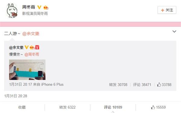 在31日晚上,在微博上余文乐@了周冬雨疑似两人将正式公开了恋情,在微博上余文乐写到:慢慢来!在随后@周冬雨的微博,随后周冬雨也在自己的微博上回应了三个字,两人游@余文乐,并且还配上了一张玩两只小鸭子玩具的动态图片。