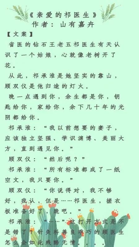 《亲爱的祁医生》,来自山有嘉卉的小说,看过他文的友友应该知道,作者还写过其他的医生文,都很不错,像《师兄,别来无恙》等。都是短篇类型的,很甜,文章很有爱,值得入。